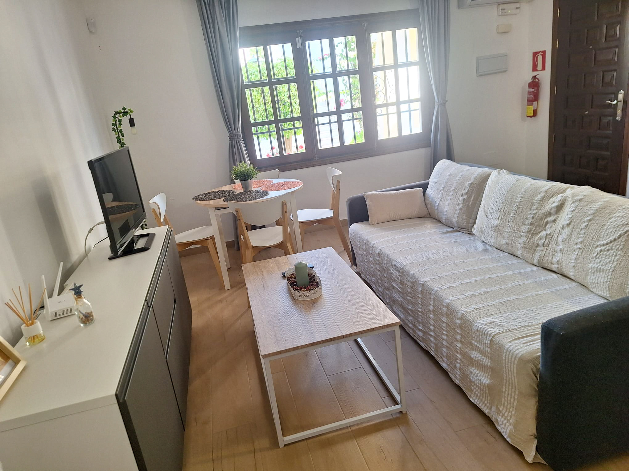 Apartamento en planta baja situado en la reconocida urbanización Vera Coast, en la zona de Las Marinas de Vera Playa, a solo 200 metros del paseo marítimo y la playa. La vivienda, completamente reformada, dispone de un dormitorio con cama doble y un sofá cama en el salón, ofreciendo capacidad para hasta 4 personas. Cuenta con aire acondicionado en el dormitorio, cocina equipada con horno, lavadora y menaje básico, y un baño moderno con ducha. Desde el salón se accede a una pequeña terraza privada ideal para desayunar o tomar algo al aire libre.
